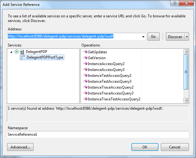 The Add Service Reference… will scan the WSDL and display the available operations. We can inspect the different operations and eventually click on OK (after possibly changing the namespace for the newly generated client). Clicking on OK will lead to: